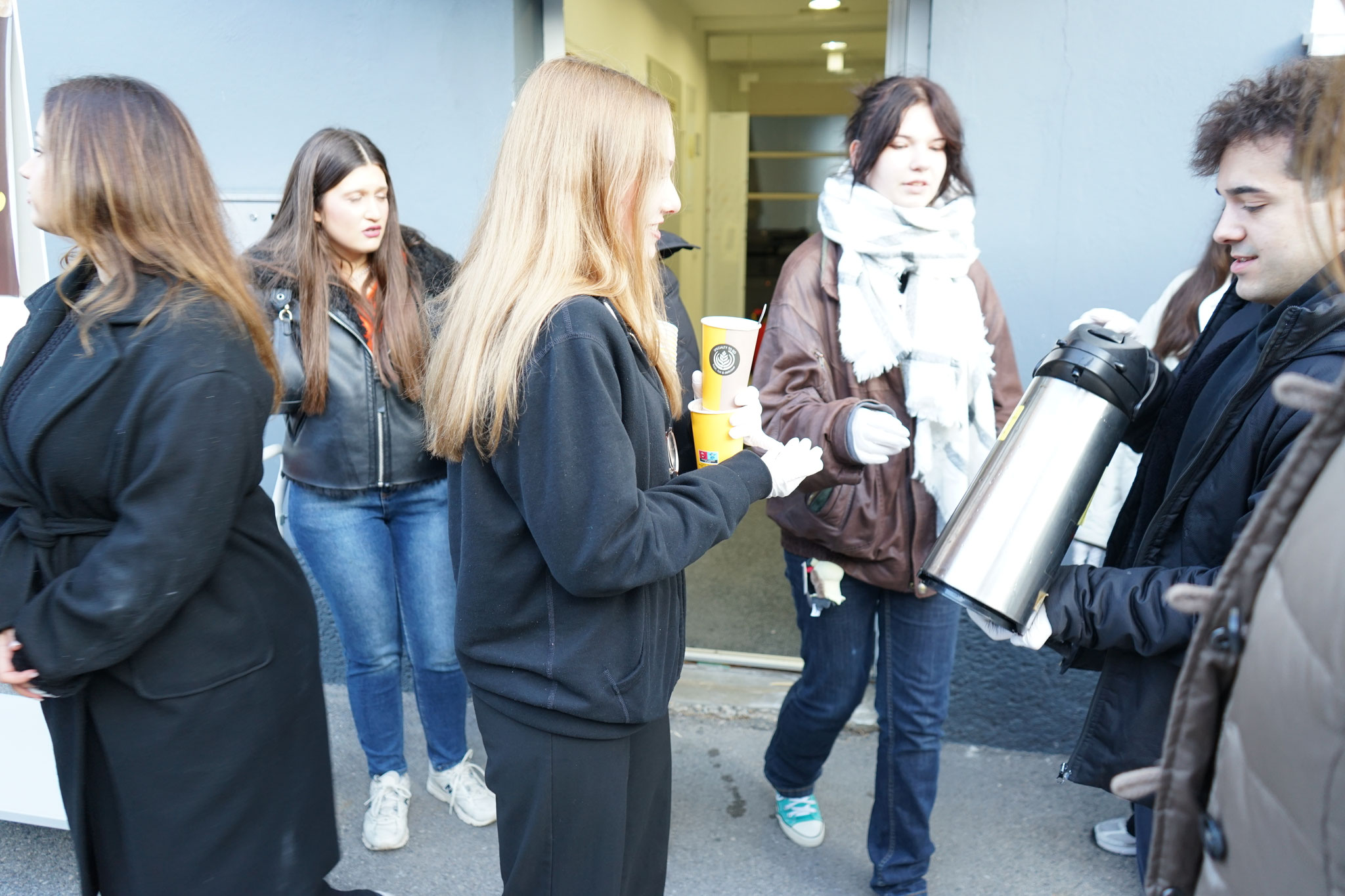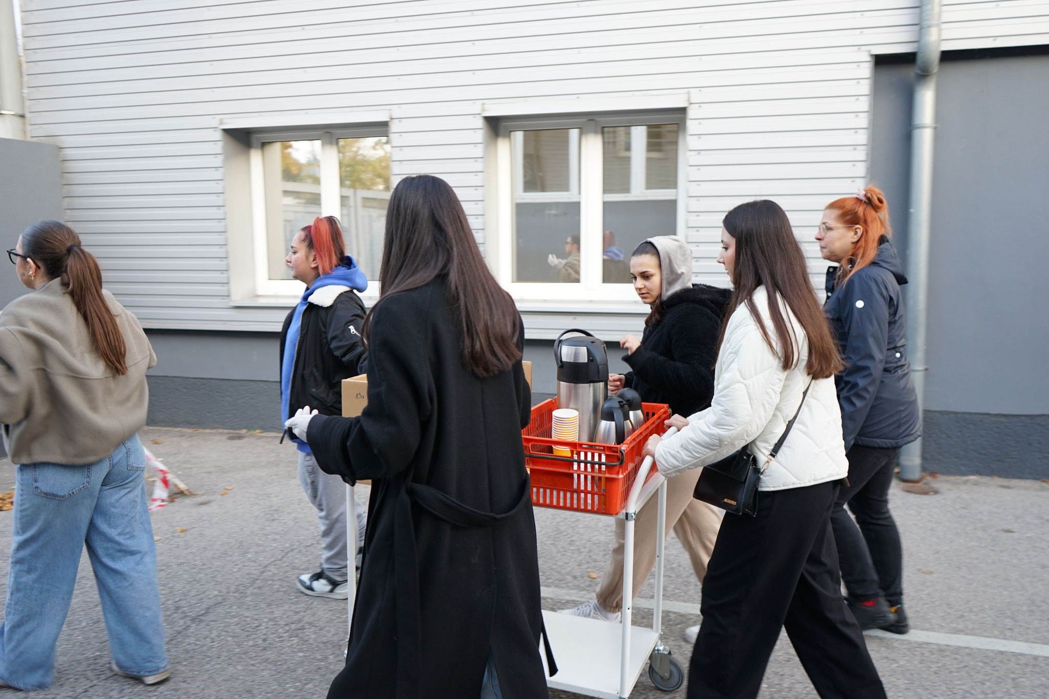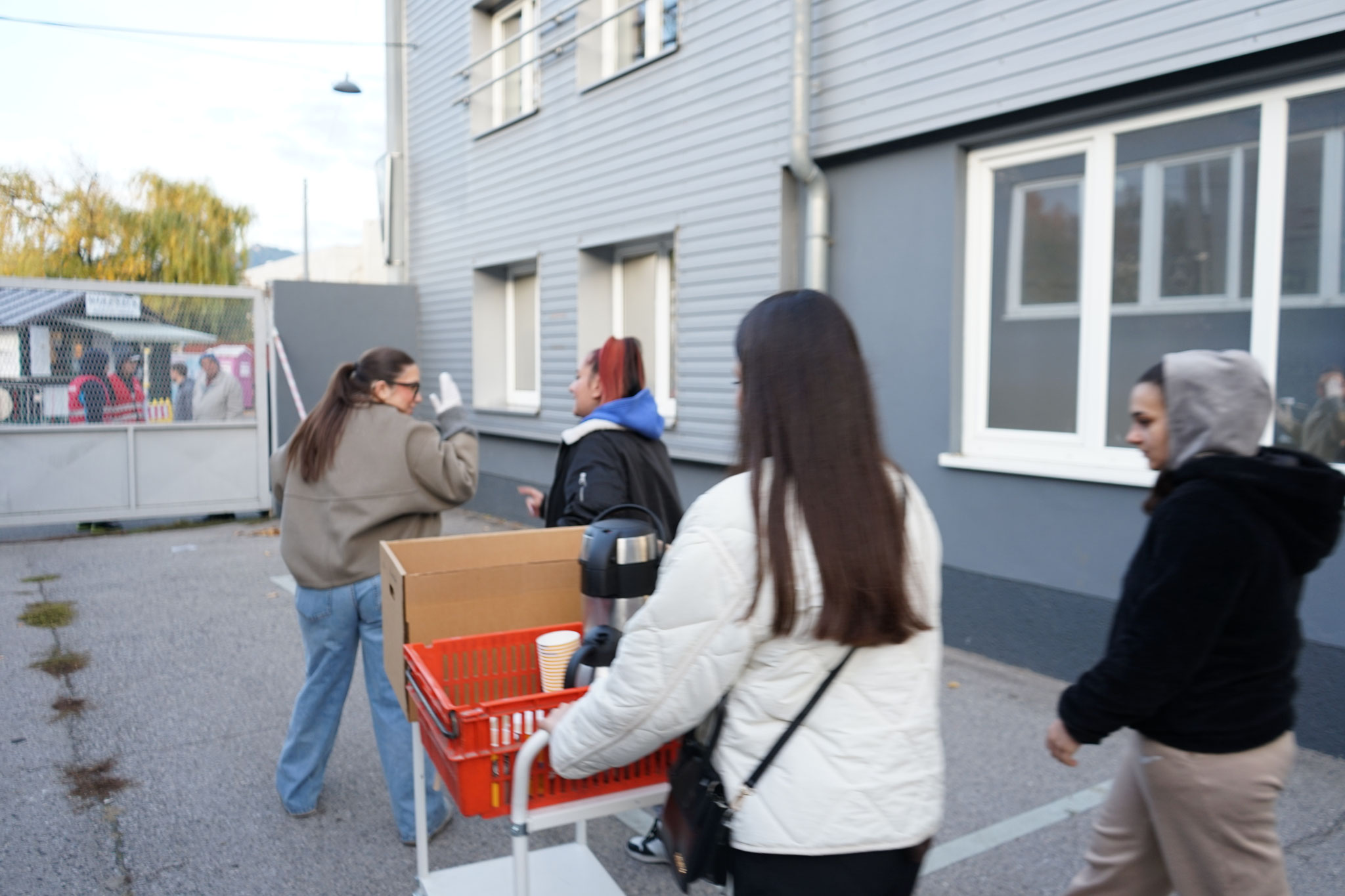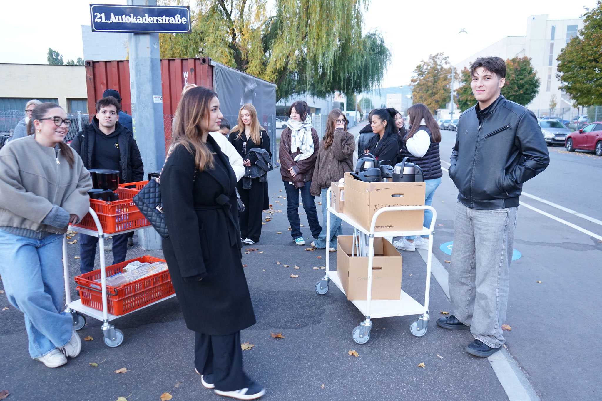 Gemeinsam beschlossen Sie zu helfen: 19 angehende Friseur*innen unterstützten die Ausgabe, schenkten Tee und Kaffee aus und verteilten Kipferl, die von der Firma Ströck gespendet wurden.